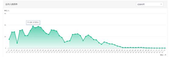 二:运动人数趋势(其中11.28:单日最高到3725人参与阳光跑,平均每日参与率:>30%)