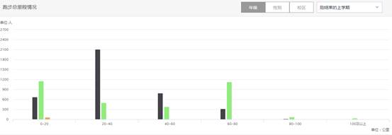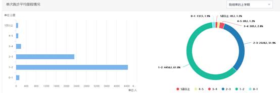 本学期平均单次跑步距离为3-4公里占比为2.8%(205人);平均单次跑步距离为2-3公里占比为31.9%(2328人);平均单次跑步距离为1-2公里占比为61%(4456人)。