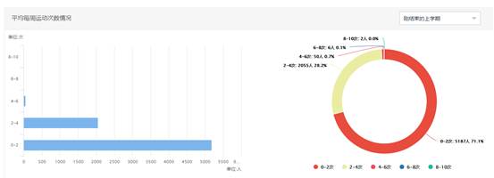 本学期学生平均每周运动4-6次占比约为0.7%(50人);平均每周运动2-4次占比约为28.2%(2055人);平均每周运动0-2次占比约71.1%(5187人)。