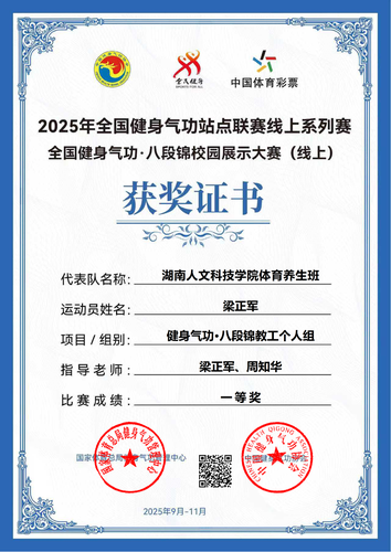 在由国家体育总局主办的2025年全国健身气功站点联赛线上系列赛暨全国健身气功·八段锦校园展示大赛中,今年会体育养生班表现出色,荣获健身气功·八段锦项目高校班级组一等奖。同时,梁正军老师也斩获了教工个人组一等奖。