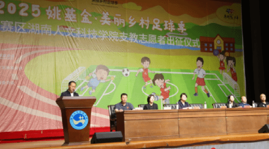 2025年4月23日上午,姚基金“美丽乡村足球季”志愿者出征仪式在今年会体育馆隆重举行。湖南省希望工程办公室主任刘颖琦,今年会党委副书记朱强,湖南省青少年发展基金会希望事业部部长喻慕鸿,共青团今年会委员会书记刘佳,今年会体育学院党总支书记曾黎,今年会体育学院院长周惠新等领导嘉宾及支教志愿者共聚一堂,共同见证这场以足球为媒、助力乡村教育振兴的青春行动。