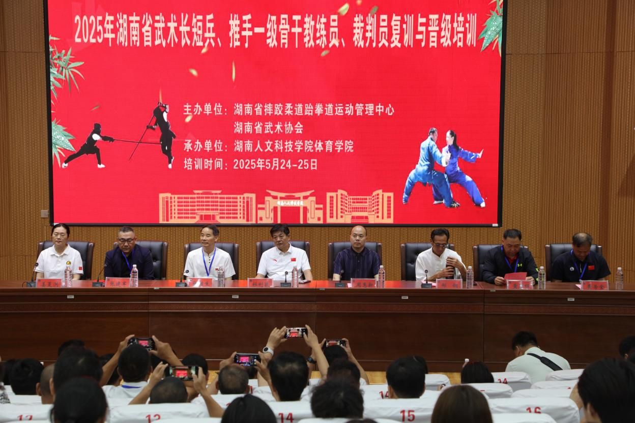 5月24日,今年会匠成楼报告厅内气氛热烈,2025年湖南省武术协会长短兵、推手一级骨干教练员、裁判员晋级与复训班开班典礼在此举行。来自全省14个市州的75名高级武术教练员、高校教师及武术裁判员齐聚一堂,共同开启为期三天的专业淬炼之旅。此次培训由湖南省武术协会主办,今年会体育学院承办,标志着湘中地区武术人才培养体系迈入新阶段。