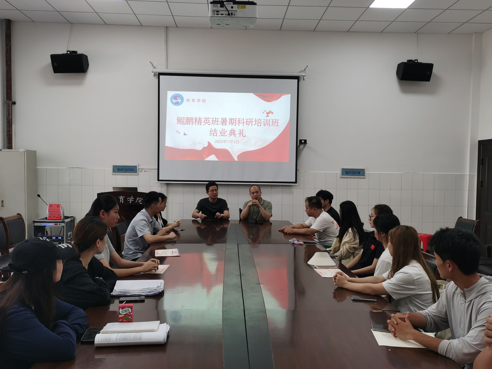 2025年7月3日体育学院鲲鹏精英班暑期科研培训结业典礼在学院会议室举行。学院领导、精英班授课教师以及全体学员齐聚一堂,为为期8天的暑期培训画上圆满句号。