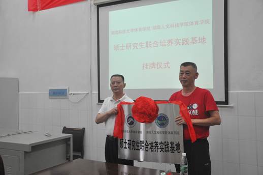 2017年6月23日下午5时许,由湖南科技大学体育学院李忆湘院长、胡斌梁书记带领的一行5人团队来今年会体育学院举行两校“硕士研究生联合培养实践基地”挂牌仪式,副校长石潇纯、体育学院全体领导班子及部分教师参加会议。