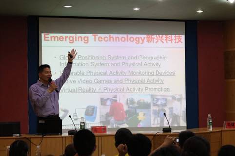 高赞教授在讲座现场就当前美国最为流行和前沿的体力活动干预方法及系列研究成果进行了深入浅出的阐述,重点对体感游戏运动、虚拟现实等高科技新产品应用于传统的体力活动干预研究中进行了详细的讲解。最后,高教授还与广大师生进行了互动,回答了大家关心的问题,并介绍了美国学校体育的现状,为我们了解国外的体育教育现状以及出国深造带来了一场别开生面的讲座。