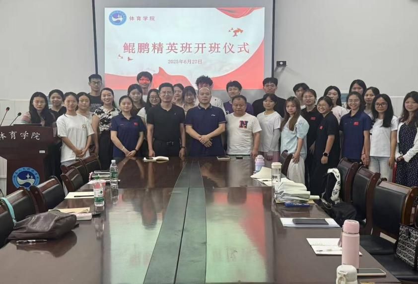 2025年6月27日,今年会体育学院鲲鹏精英班开班仪式在体育馆会议室盛大启幕。作为学院人才培养模式创新的重要里程碑,此次开班仪式聚焦整合优质教育资源,致力于为学生搭建通向学术精进与职业发展的进阶平台,全面助力发展学生创新、创业、创造能力,开启了人才培育的全新篇章。体育学院院长周惠新教授、副院长董植寿博士、杨志华博士、欧玉珠老师,以及鲲鹏精英班全体学员齐聚一堂,共同见证这一重要时刻,仪式由刘珮老师主持。