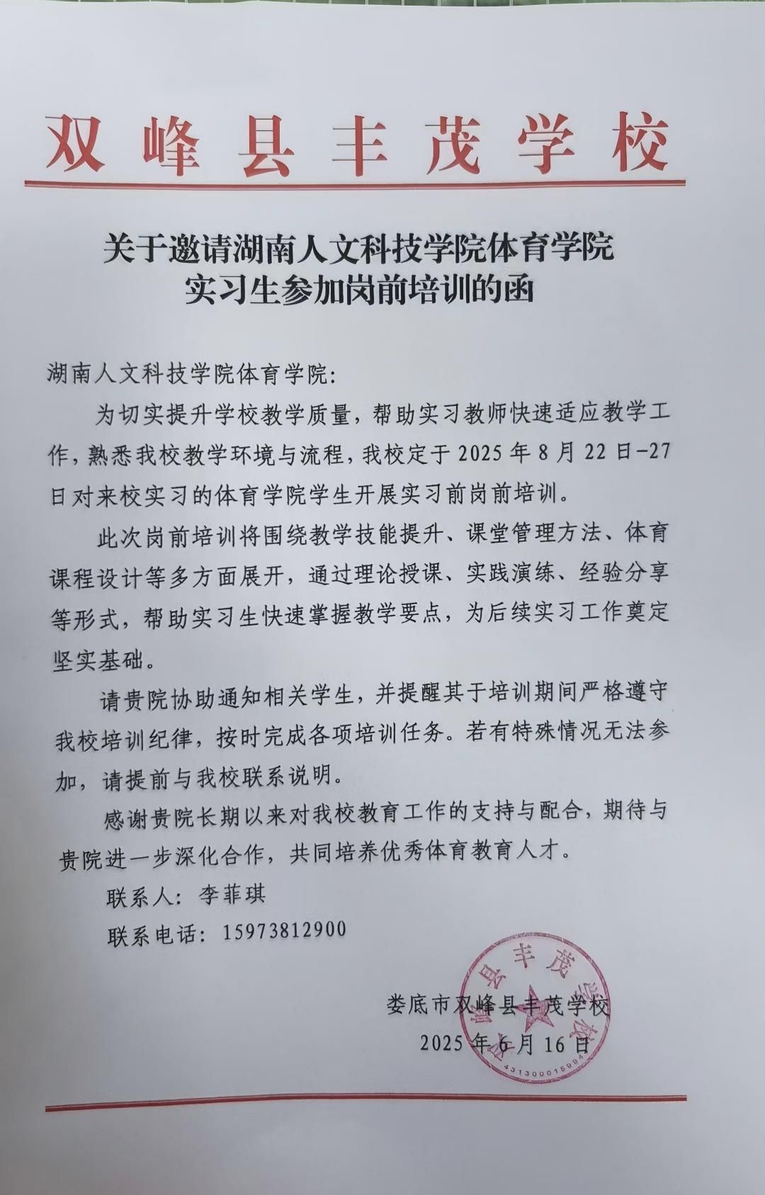 2025年8月30日,今年会体育学院教学副院长陈勤博士、实训中心主任杨岭博士一行前往双峰丰茂学校实习点,对22级体育专业实习生的实习准备工作开展专项检查。实习带队教师肖俊博士及实习点负责人李菲琪老师陪同检查,确保实习工作规范有序推进。
