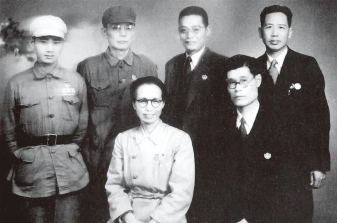 参加中国人民政治协商会议第一届全体会议的台盟代表。左起:田富达、杨克煌、谢雪红、李伟光、王天强、林铿生(候补)中国民主党派历史陈列馆供图