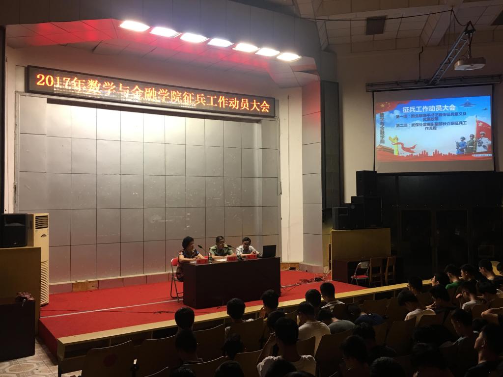 优秀青年立志从军,热血男儿精诚报国。为积极响应国家征兵的号召,鼓励适龄青年踊跃报名参军,5月11日晚,数学与金融学院率先召开了二级学院的征兵工作动员大会。雷振东副部长出席大会并做重要讲话,他强调适龄青年要自觉践行《兵役法》,严格履行国家服兵役义务,积极争取到部队锻炼,为祖国、为社会、为家乡人民作出贡献。(文/图 刘惠娟)
