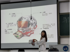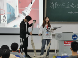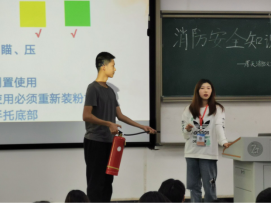 厚天消防义工团人文分队讲师团部长张嘉雯对消防安全知识进行系统讲解。向同学们普及了火灾的危害、类型及相应的灭火方式和注意事项;演示了干粉灭火器、消防栓和灭火毯等灭火器材的使用方法及注意事项,并现场邀请同学上台互动操作;最后讲解了遭遇火灾后如何正确逃生,并演示了防毒面罩的正确使用方法。