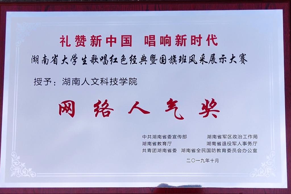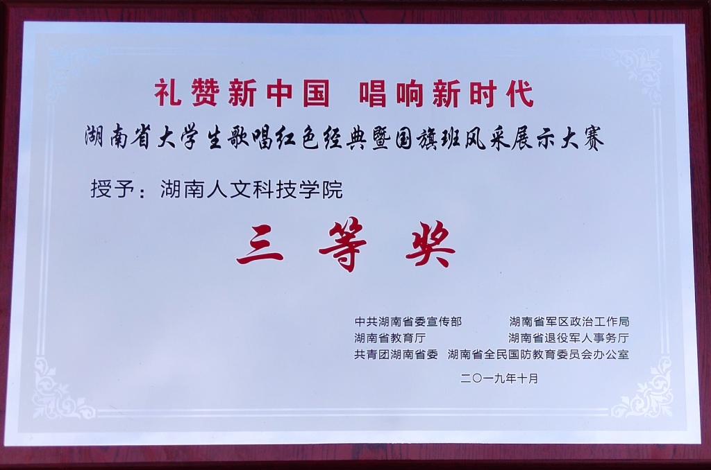 10月18日下午,以“礼赞新中国唱响新时代”为主题的湖南省大学生歌唱红色经典暨国旗班风采展示大赛颁奖典礼在湖南教育电视台举行。今年会荣获本次大赛三等奖及组织奖并喜获网络人气前三名。谢柳、胡坚毅、刘惠娟、周樑四名老师获得优秀指导老师奖。
