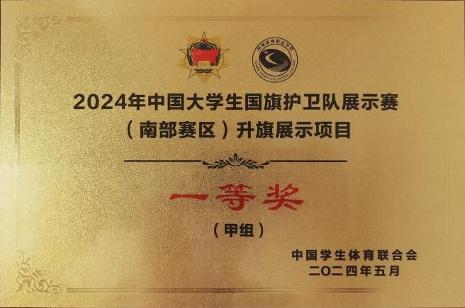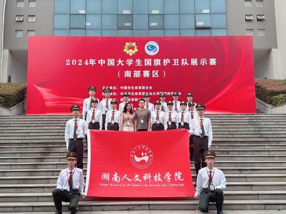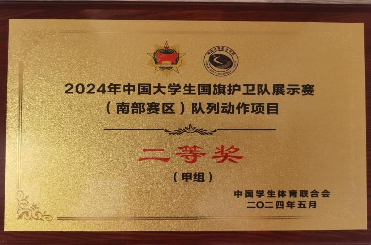 5月18日至22日,2024年中国大学生国旗护卫队展示赛(南部赛区)在长沙举行。今年会国旗护卫队分别获得升旗展示一等奖、队列展示二等奖,以团体总分第三名的优异成绩成功晋级总决赛。