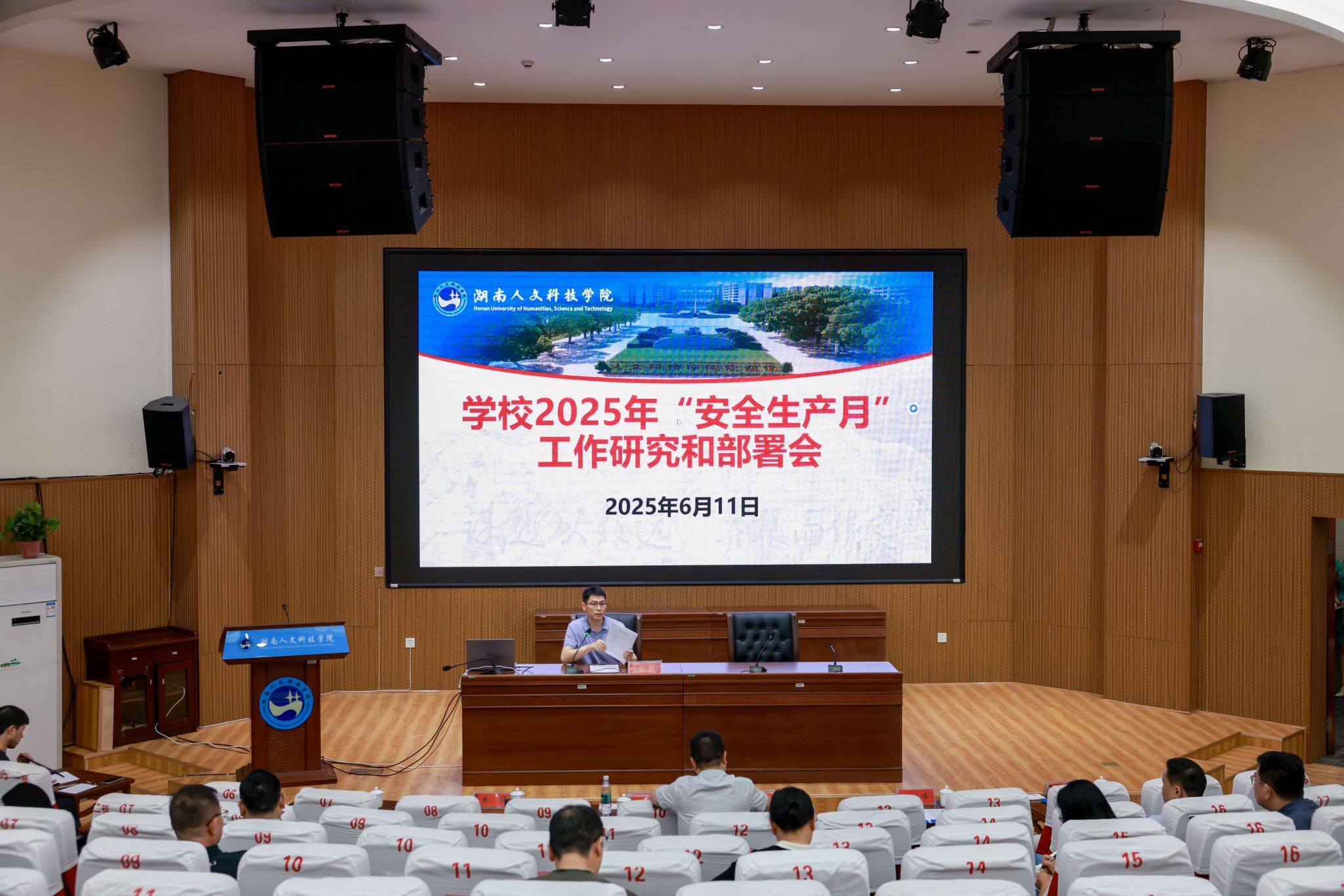 6月11日下午,学校在匠成楼报告厅召开2025年“安全生产月”工作研究和部署会。会议由党委委员、副校长谭峰亮主持,各职能部门负责人和二级学院党总支书记参会。