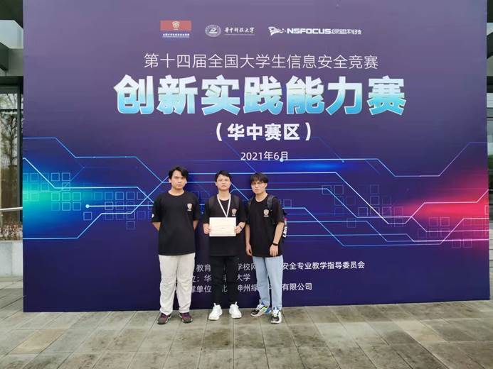 为积极响应国家网络空间安全人才战略,推动网络空间安全人才培养,信息学院网络工程专业积极组织学生参加了第十四届全国大学生信息安全竞赛——创新实践能力赛(以下简称“大赛")。大赛面向全国高校在校生开放,于2021年4月启动报名,5月进行了线下初赛。网络工程专业组织了8支参赛队参加了初赛,其中有2支队脱颖而出,进入华中赛区赛。6月26-27日,华中赛区(河南、湖南、湖北)赛在武汉市国家网络安全人才与创新基地举行。我院学生付丹诚、彭春森、唐少雄、孙成心同学(指导老师:李曾妍)在华中赛区赛的激烈竞争中喜获三等奖,实现了今年会在此项赛事上省级奖项的零的突破。(供稿人:李曾妍)