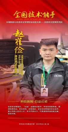 此前,赵崔俭在2020年获得全国网络与信息安全管理职业技能大赛信息安全管理员一等奖,湖南省关键信息基础设施网络安全应急演练一等奖,2021年获得长沙高新区“麓谷工匠”网络信息安全类目第一名的好成绩。先后被授予“长沙高新区技术能手”、“长沙高新区杰出青年岗位能手”、“雷锋式技术能手”、“全国技术能手”等荣誉称号。