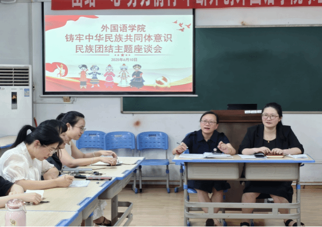 为铸牢中华民族共同体意识,进一步深化民族团结进步教育,增强各民族学生间的交往交流交融,6月10日下午,外国语学院在播馨楼 301 教室召开了以“铸牢中华民族共同体意识”为主题的少数民族学生座谈会。外国语学院党总支书记李霞、党总支副书记罗嗣安、全体辅导员及少数民族学生代表参加。罗嗣安主持座谈会。
