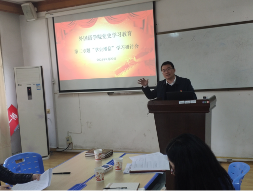 2021年4月20日下午,外国语学院党总支在播馨楼301召开党史学习第二专题“学史增信”学习研讨会。学院党政班子成员,各支部书记,“三办”主任以及分工会主席出席会议。学院党总支书记阳立新主持会议。