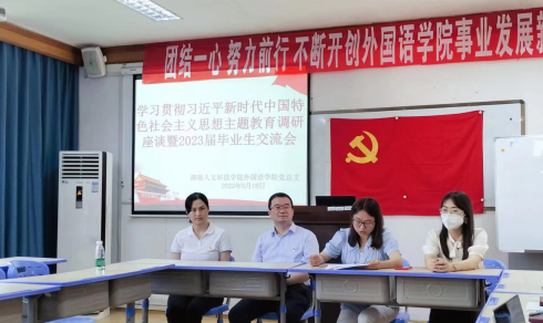 2023年5月18日下午,外国语学院党总支在播馨楼301举行了学习贯彻习近平新时代中国特色社会主义思想主题教育调研座谈暨2023届毕业生交流会。外国语学院党总支书记阳立新、专职组织员曹瑜虹、就业专干朱倩与50多名毕业生代表围坐在一起,交流收获,展望未来。座谈会由学生支部书记龙立平主持。