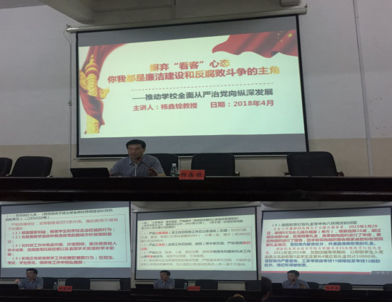 杨鑫铨教授首先解读了十八大以来从严治党和反腐败斗争取得的显著成效及十九大对全面从严治党提出的新要求。紧接着,就与教师息息相关的主要纪律规定:《教育部关于建立健全高校教师师德建设长效机制的意见》、《严禁教师违规收受学生及家长礼品礼金等行为的规定》、《关于党和国家工作人员操办婚丧喜庆事宜的暂行规定》、《中国共产党纪律处分条例》及“公款接待”、“禁赌限牌”等有关纪律规定进行了深入学习。最后,讲座在湖南省违纪腐败的典型案例通报中圆满落幕。