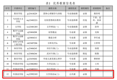 为督促教师全心投入教学,精心设计课堂教学,以迎接师范类专业认证为契机,近日,学校对本学期开设的师范类专业的课程教案(含公共课)进行全面检查,经学校组织专家综合评审,由公共外语教研室教师设计的《大学英语A(三)》教案,赢得了评委的一致高度评价,最终斩获佳绩,荣获“优秀教案”!这份荣誉,不仅是对教师教学能力的肯定,也是对外国语学院在教学改革创新与实践探索中取得成绩的肯定和认可,更是对学校长期以来坚持“学生中心、产出导向、持续改进”教学理念的生动诠释。