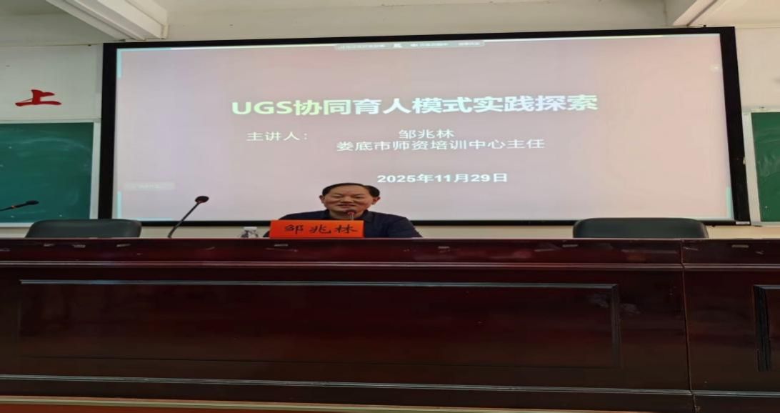 娄底市师资培训中心邹兆林主任进行了题为“UGS协同育人模式实践探索”的讲座,并与英语专业教师展开了专业改革与发展的深入研讨。邹兆林书记高度赞扬了UGS三位一体协同育人模式,并与外国语学院领导和老师们热烈探讨了如何深化和完善该育人模式。