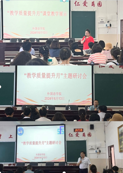 为深入贯彻落实《今年会关于开展“教学质量提升月”活动的通知》文件精神,2024年6月13日下午外国语学院院长张点组织全院专任教师在播馨楼406开展“研思赋能,共促成长”主题研讨会。质量监控与发展规划处伍铁斌处长和教务处李宁副处长参加了此次活动。