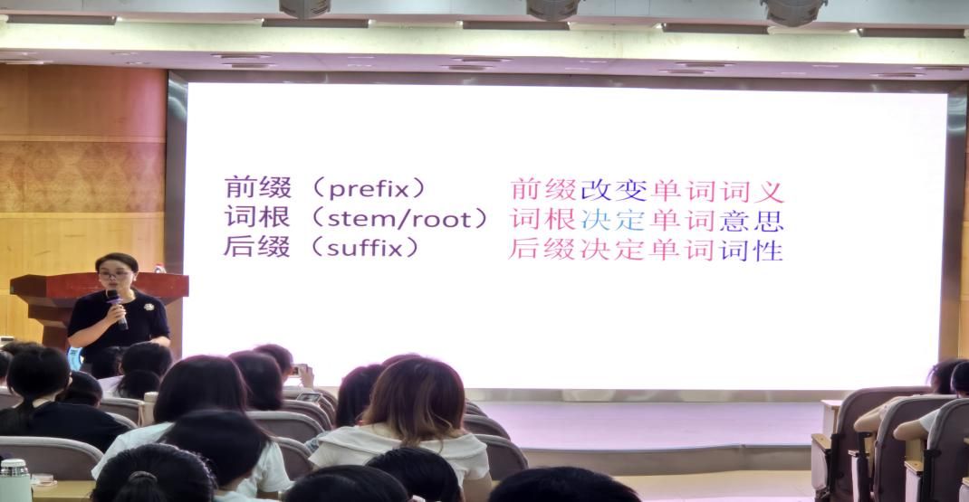 讲座伊始,石艳平老师以“我写、我能、我可以”这一激励口号开场,分享了她如何通过积极引导激发学生的英语学习热情,在词汇教学方面,石老师重点讲解了词缀学习法,并结合高考真题分析,展示了如何通过词根词缀帮助学生高效记忆单词,提升语言应用能力。石老师还分享了她在创意写作教学中的实践经验,鼓励学生通过自由表达培养英语思维。同时,她强调了阅读的重要性,提倡教师引导学生广泛阅读,以拓展语言输入渠道,提升综合语言素养。