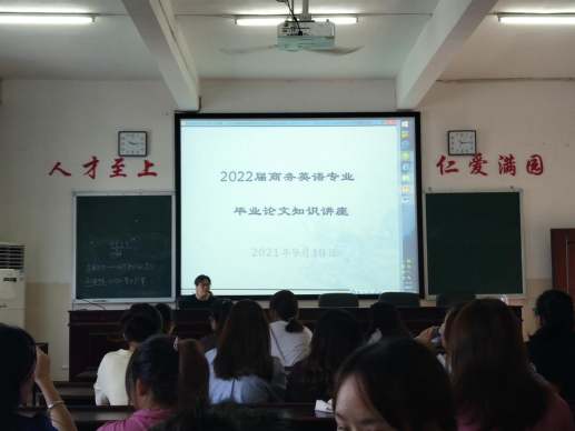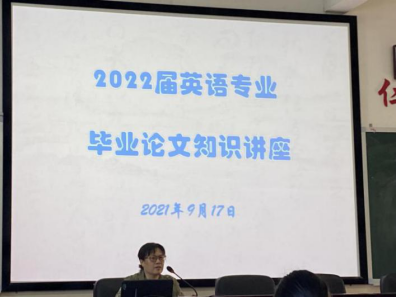 2021年9月10日、17日,外国语学院在播馨楼406分别举办了2022届商务英语和英语专业毕业论文知识讲座,讲座由副院长卿逸豪主讲,外国语学院2022届商务英语、英语专业毕业生参加。