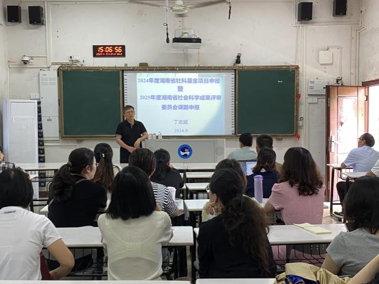 为推动学院科研工作再上新台阶,外国语学院于9月24日下午在播馨楼203举行2024年度湖南省社科基金项目与2025年度湖南省社会科学成果评审委员会课题申报动员大会,会议由刘晓东副院长主持,院学术委员会主任丁志斌教授主讲,参会人员为外国语学院部分专任教师。