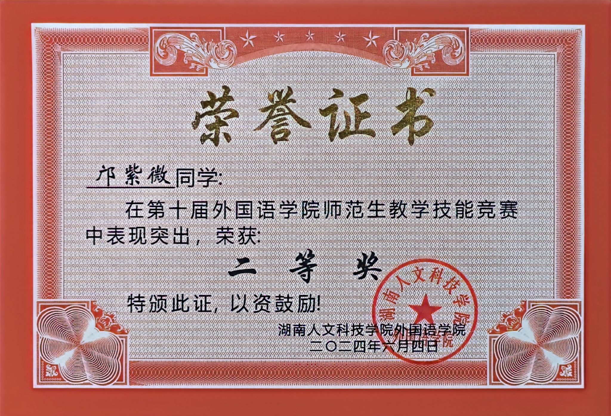 学习上,我始终锚定目标,奋力前行,优异的成绩、靠前的年级排名,是我逐梦路上的脚印。为了在专业知识的海洋中遨游得更远,我日夜钻研,课堂上紧跟老师思路,课后主动拓展阅读。这份努力让我斩获国家励志奖学金,在师范生技能大赛中崭露头角,还多次获评三好学生标兵。全国英语专业四级考试获优秀等级、取得高中英语教师资格证,更是见证了我在专业领域的深耕细作,让我在未来的教育之路上有了更足的底气。