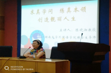 9月11日下午,78级校友、湖南大学外国语学院博士生导师陈晓湘教授在养根楼报告厅为外国语学院2018级全体新生做了一场题为“求真学问,练真本领,创造靓丽人生”的讲座。