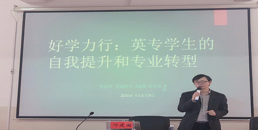 2018年11月2日下午,复旦大学新闻学院副教授邓建国在播馨楼406为外国语学院师生做了“英专学生的自我提升和专业转型”的专题讲座。外国语学院领导、老师和学生代表共计200余人参加了此次讲座。
