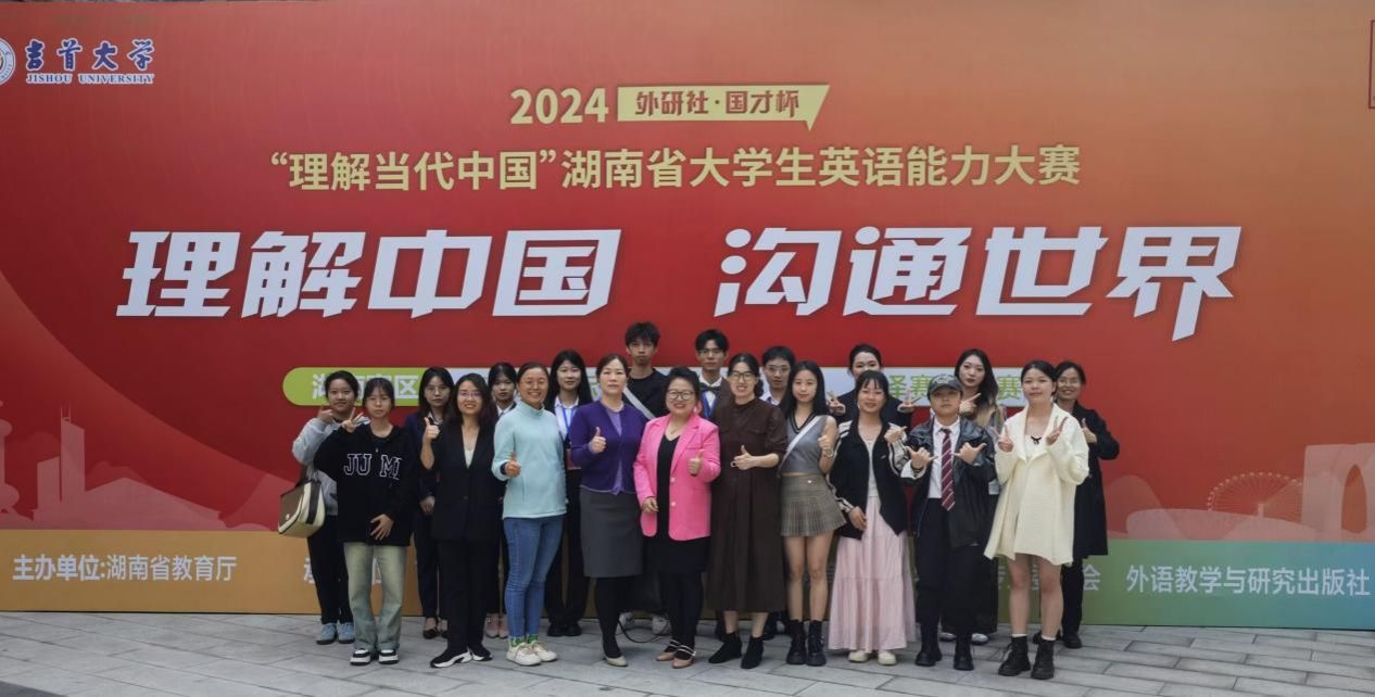11月1日至3日,2024年“外研社·国才杯”“理解当代中国”湖南省大学生英语能力大赛在吉首举行,省内40余所高校参赛。经过激烈的角逐,今年会代表队在众多高校中脱颖而出,获得团体银奖。在国际传播综合能力赛道,由外国语学院吴岚、贺辉、邓梦林、禹逸群四位教师指导的7名学生,外国语学院何帅、教育学院周亦蕊和黄诗妤、法学院李佳圆和鲁浩、商学院邱月、文学院曹梓玥闯入决赛,并获得银奖7项。在笔译赛道,由外国语学院蒋坎帅、王春晖、韦萍三位教师指导的本院3名学生,王婷、梅鑫龙、赵亮分别获得金、银、铜奖各1项;在短视频赛道,由外国语学院教师刘欣磊、张晶露分别指导的本院学生朱嘉鸿、吴可婷的作品《当梅山拳遇上元宇宙》和《情系傩狮舞》获得铜奖2项。