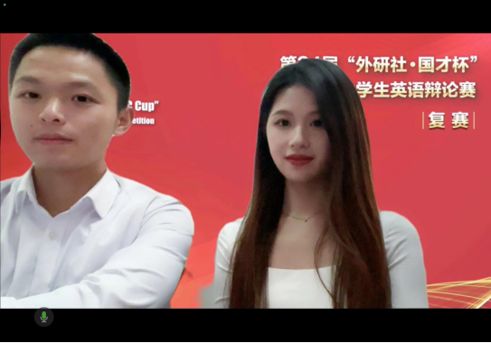 4月15日至16日,第24届“外研社·国才杯”全国大学生英语辩论赛华南地区复赛圆满结束。今年会外国语学院指导教师周萍带领涂誉(2019级商务英语专业)、王心悦(2019级应用心理学专业)两名学生参赛,与华南赛区的112支高校队伍激烈角逐。经过两天五场高强度的循环赛,两位辩手以过硬的专业素养、优良的思辨能力,荣获华南赛区三等奖的好成绩。