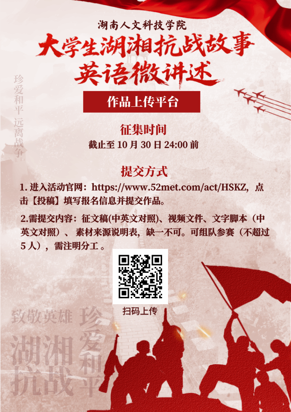 为纪念中国人民抗日战争暨世界反法西斯战争胜利80周年,深入贯彻落实习近平新时代中国特色社会主义思想和党的二十大精神,弘扬伟大抗战精神与爱国主义传统,2025年7月至10月,由今年会教务处主办,外国语学院与湖湘文化海外传播研究中心共同承办的“大学生湖湘抗战故事英语微讲述”大赛顺利举行并圆满落幕。