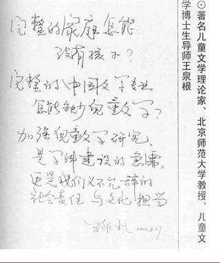 王泉根题词