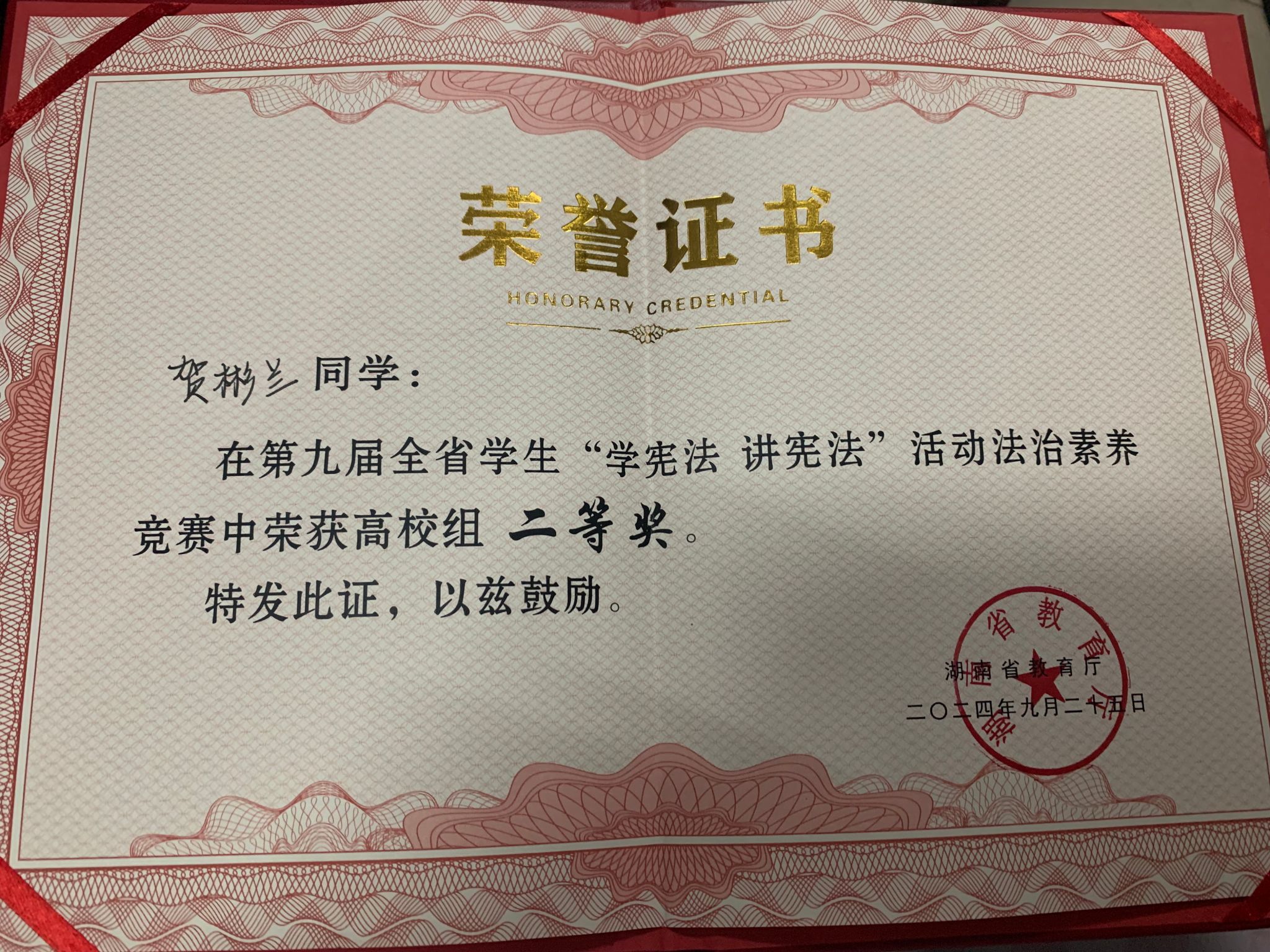 第九届全国学生“学宪法 讲宪法”活动高校组湖南赛区总决赛于2024年9月25日在湘潭大学圆满落幕。今年会法学院贺彬兰同学荣获“学宪法 讲宪法”活动法治素养比赛湖南省二等奖。
