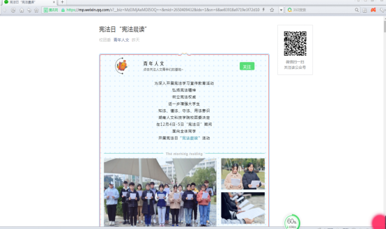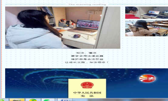 1、12月4日至12月5日,校团委以团支部为单位组织学生开展宪法日“宪法晨读”创意视频拍摄活动,拍摄视频共58个,参与学生共有3200人次。