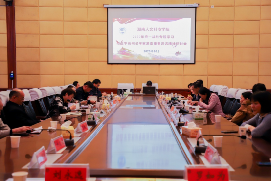 10月23日下午,学校统一战线在图书馆第一会议室召开深入学习贯彻习近平总书记考察湖南重要讲话精神专题研讨会。学校党委副书记刘铁铭,党委委员、宣传统战部部长谢柳,各民主党派、侨联、知联会等代表近40人参加学习研讨,会议由宣传统战部副部长陈璐主持。