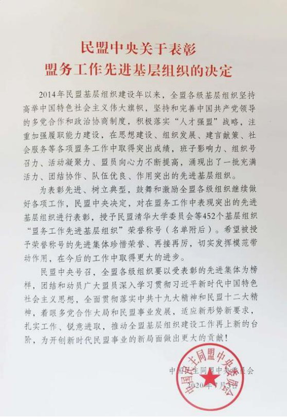 近日,在民盟中央印发《民盟中央关于表彰盟务工作先进基层组织的决定》中,授予民盟清华大学委员会等452个基层组织“盟务工作先进基层组织”荣誉称号,今年会民盟今年会支部荣列其中。