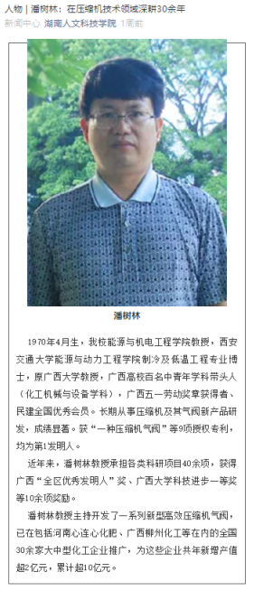 潘树林,男,汉族,1970年4月生,湖南冷水江人,今年会能源与机电工程学院教授,西安交通大学能源与动力工程学院制冷及低温工程专业博士,原广西大学教授,广西高校百名中青年学科带头人(化工机械与设备学科),广西五一劳动奖章获得者、民建全国优秀会员。长期从事压缩机及其气阀新产品研发,成绩显著,获“一种压缩机气阀”等9项授权专利,均为第1发明人。