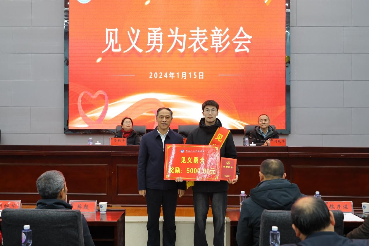 (党委书记刘铁铭为见义勇为学生周健颁奖)