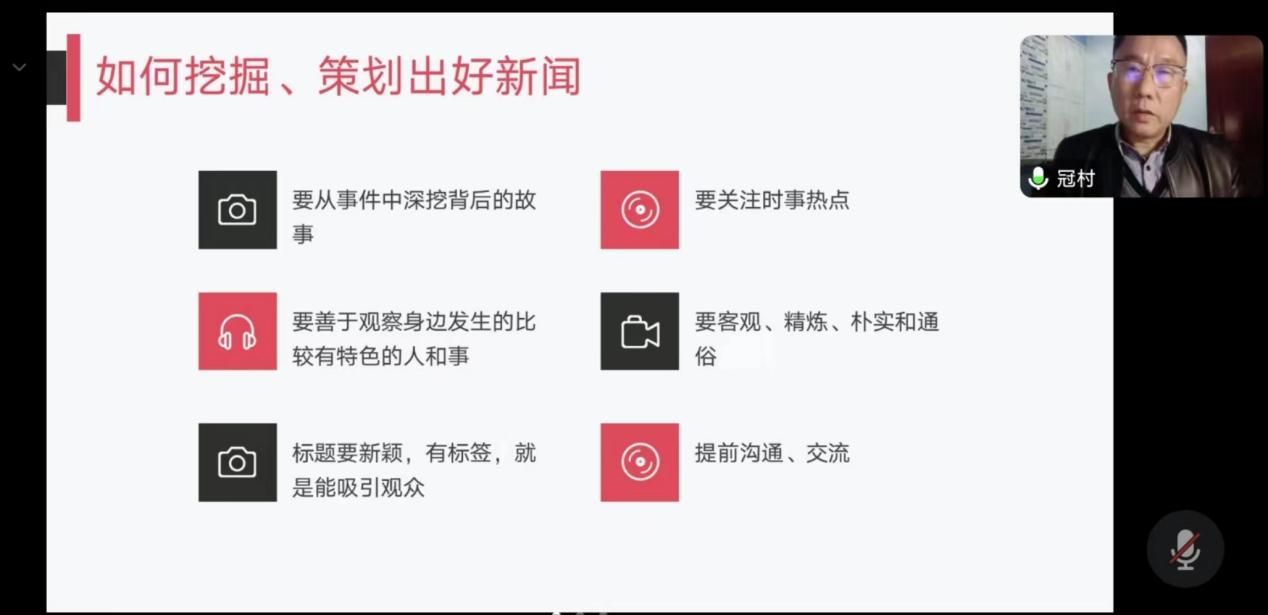 培训会上,吴冠村围绕如何策划一个新媒体短视频,从主题策划、新闻现场报道、叙事人称、字幕符号四个方面进行了详细的讲解,结合自身二十多年的工作经验,引用大量优秀短视频新闻实例,用简朴的语言分析了优秀短视频的特点。就如何挖掘、策划出好新闻,吴冠村提出六条宝贵建议;根据学生记者的特性,他提供了许多校园新闻的策划思路。在提问环节,大家踊跃发言,吴冠村结合事例,耐心回答了大家的问题并给出了解决办法。