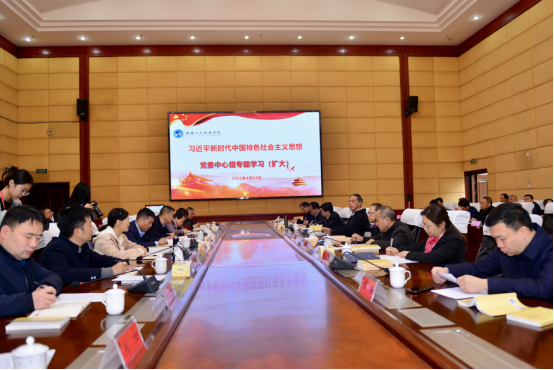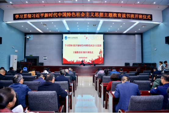 4月24日上午,学校在图书馆二会议室举行学习贯彻习近平新时代中国特色社会主义思想主题教育读书班开班仪式。开班仪式结束后,在图书馆一会议室开展党委中心组(扩大)学习会暨读书班第一次学习。全体校领导和中层正职参加,党委副书记李军林主持。