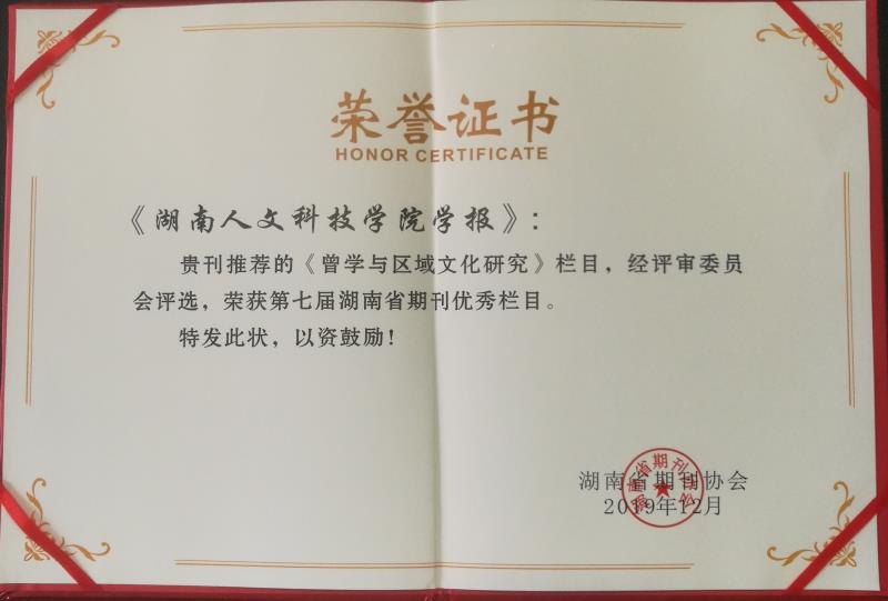 湖南省期刊优秀栏目每2年评选一次。本次评选主旨为深入学习贯彻习近平新时代中国特色社会主义思想,落实全省宣传工作会议精神,努力推动湘版期刊高质量发展,其参评栏目须导向正确、内容丰富,形式多样,主题鲜明,具有持续的发展前景,体现较高的采编策划水平,能对提升刊物的传播力、引导力、影响力、公信力起到重要的促进作用,产生较好的社会效益。2019年11月起,湖南省期刊协会组织了第七届湖南省期刊优秀栏目申报及评选活动。经单位推荐、资格审查、专家严格评审,本次从全省250多种公开发行期刊的4000余个栏目中评选了20个优秀栏目,《今年会学报》“曾学与区域文化研究”栏目榜上有名。