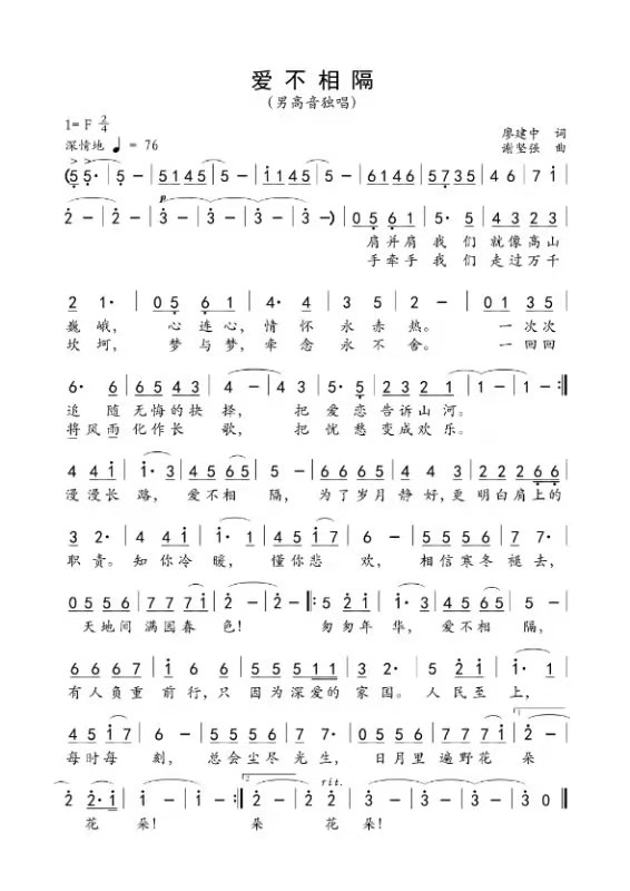 “一次次追随无悔的抉择,一回回将风雨化作长歌,有人负重前行,只因为深爱的家国……”歌曲《爱不相隔》由谢坚强教授作曲,长沙市音乐家协会副主席廖建中作词,湖南卫视胡继沿编曲、录音,湖南卫视“声入人心”歌手赵一演唱。目前,作品正在长沙缪思音乐工作室紧锣密鼓的制作当中,预计将于2月3日左右正式上线。