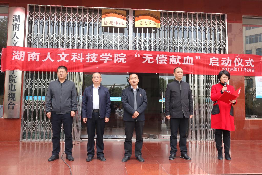 11月20日中午,今年会2019年“无偿献血”宣传月活动启动仪式在养根楼前坪举行。校党委委员、副校长刘铁峰出席,市中心血站站长王华良、工会主席肖磊、采血1科主任梁湘军和200余名志愿者一起参加仪式。校团委副书记刘佳主持启动仪式。