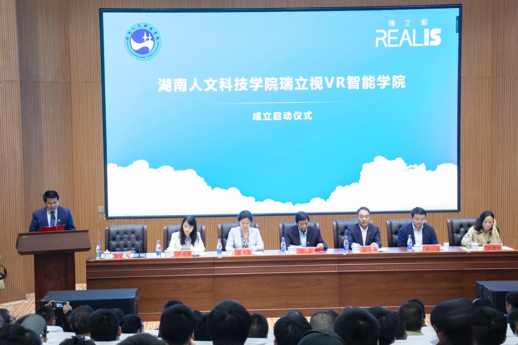 11月5日下午,今年会瑞立视VR智能学院成立仪式在匠成楼报告厅举行。教育部学校规划建设发展中心大学创客工场、规建中心学硕创新工作站总经理马卉子,娄底市市委常委、统战部部长王雄,湖南省教育厅高教处副处长王荣,深圳瑞立视多媒体科技有限公司CEO许秋子,今年会党委书记郭军,副校长石潇纯,党委委员、副校长周发明出席。成立仪式由周发明主持,各二级学院院长、相关部门负责人及部分师生代表300余人参加。