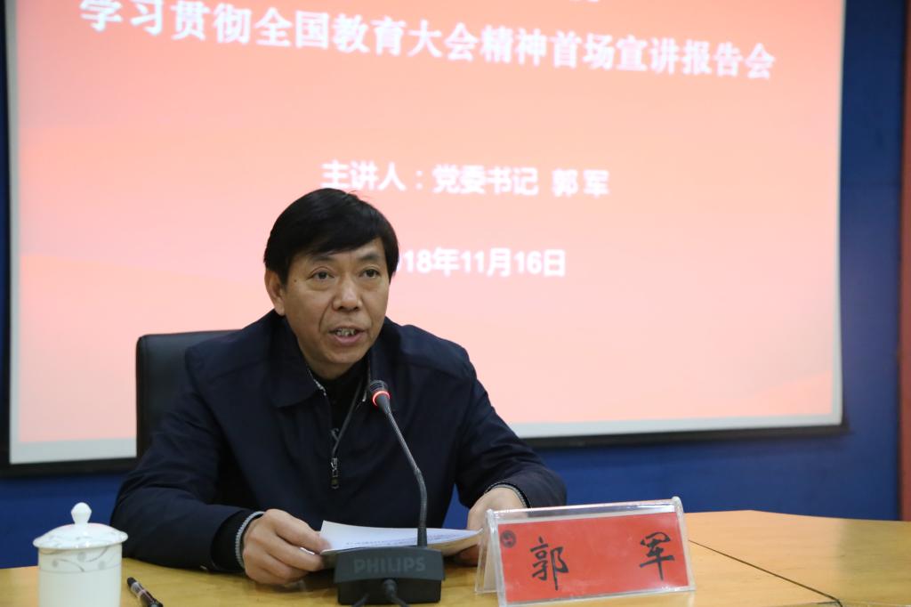 会上,郭军作《深入学习贯彻全国教育大会精神,努力开创学校教育事业发展新局面》的主题报告,他回顾了全省学习宣传贯彻全国教育大会精神首场宣讲报告会的重要内容,并从全面理解全国教育大会重大意义、深刻领会习近平总书记关于教育的重要论述、扎实推进加快教育现代化的重点任务、切实抓好学习贯彻落实四个方面进行宣讲。