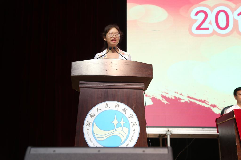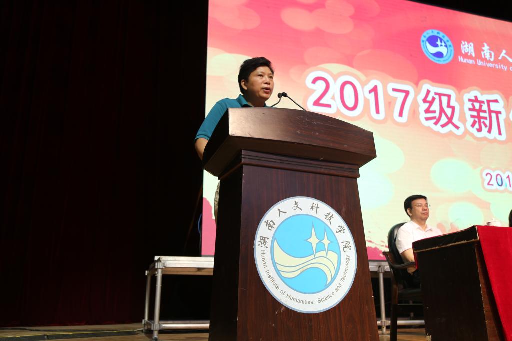 全国优秀教师、湖南省五一劳动奖获得者、信息学院李曾妍老师代表全校教师发言。她鼓励新同学积极思考,主动学习,充分发挥自己的聪明才智,在大学四年后,能成为一个全面发展的大学生。